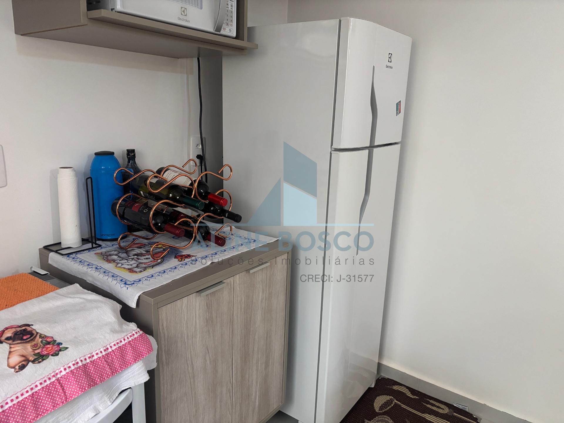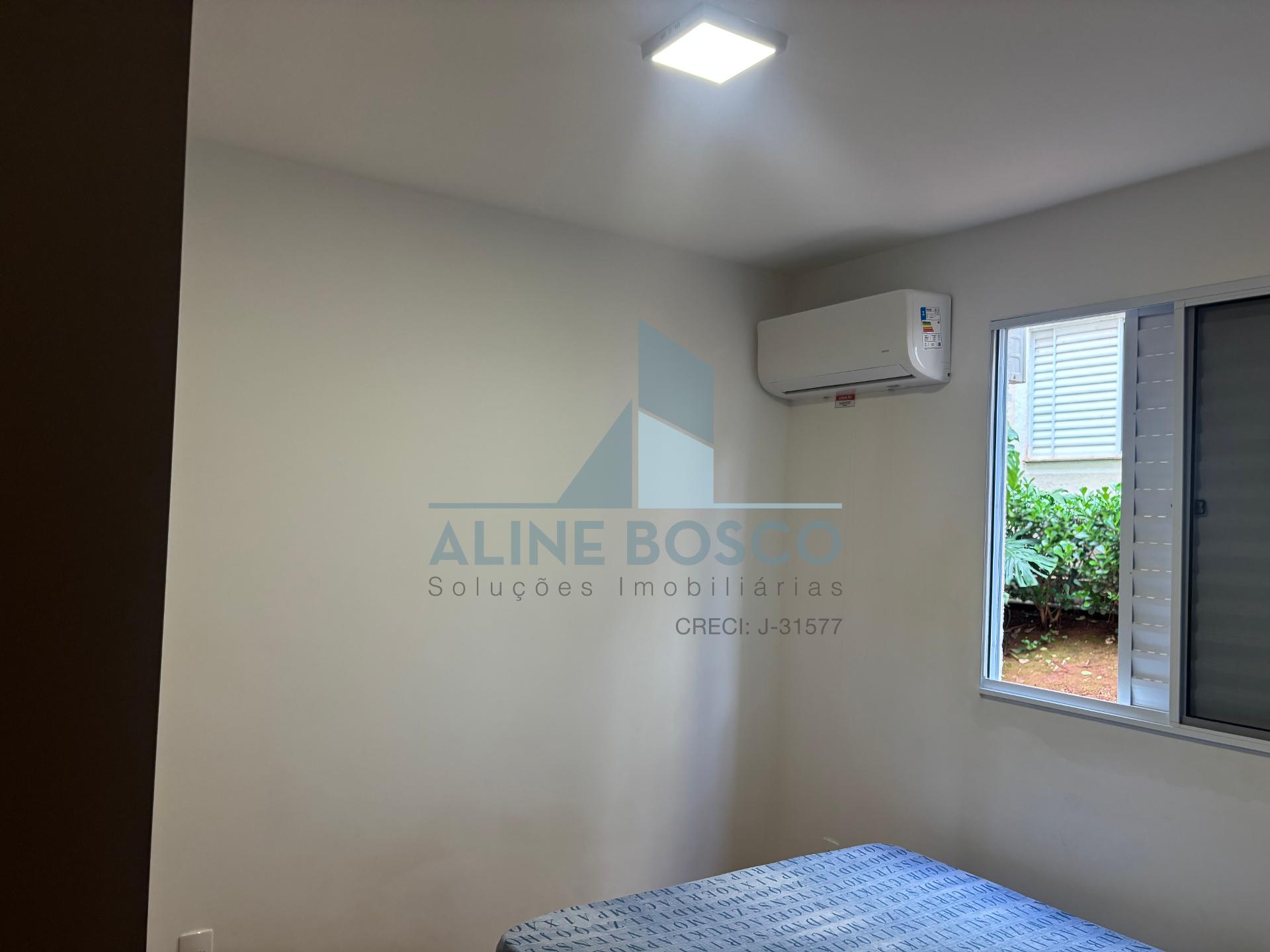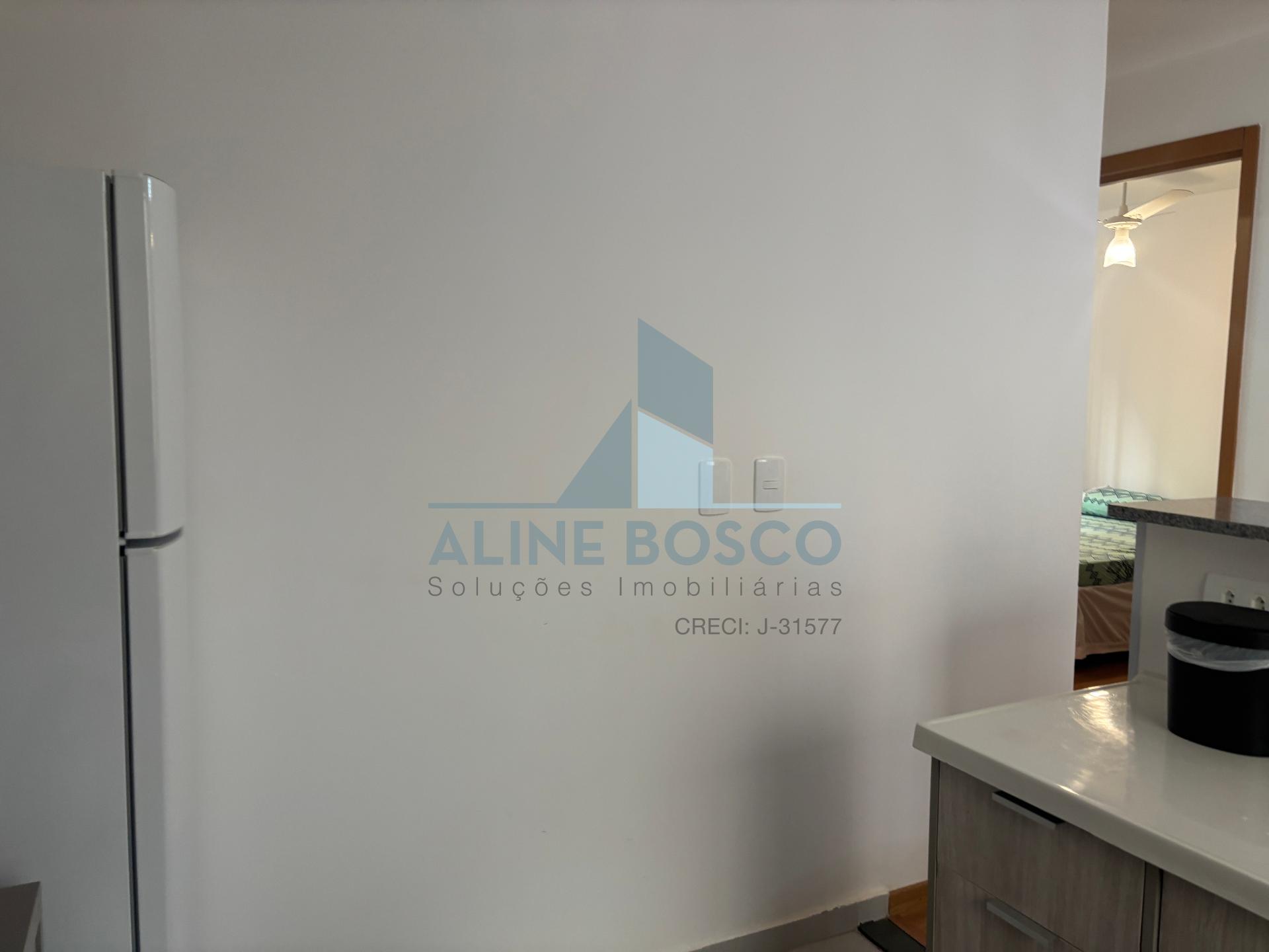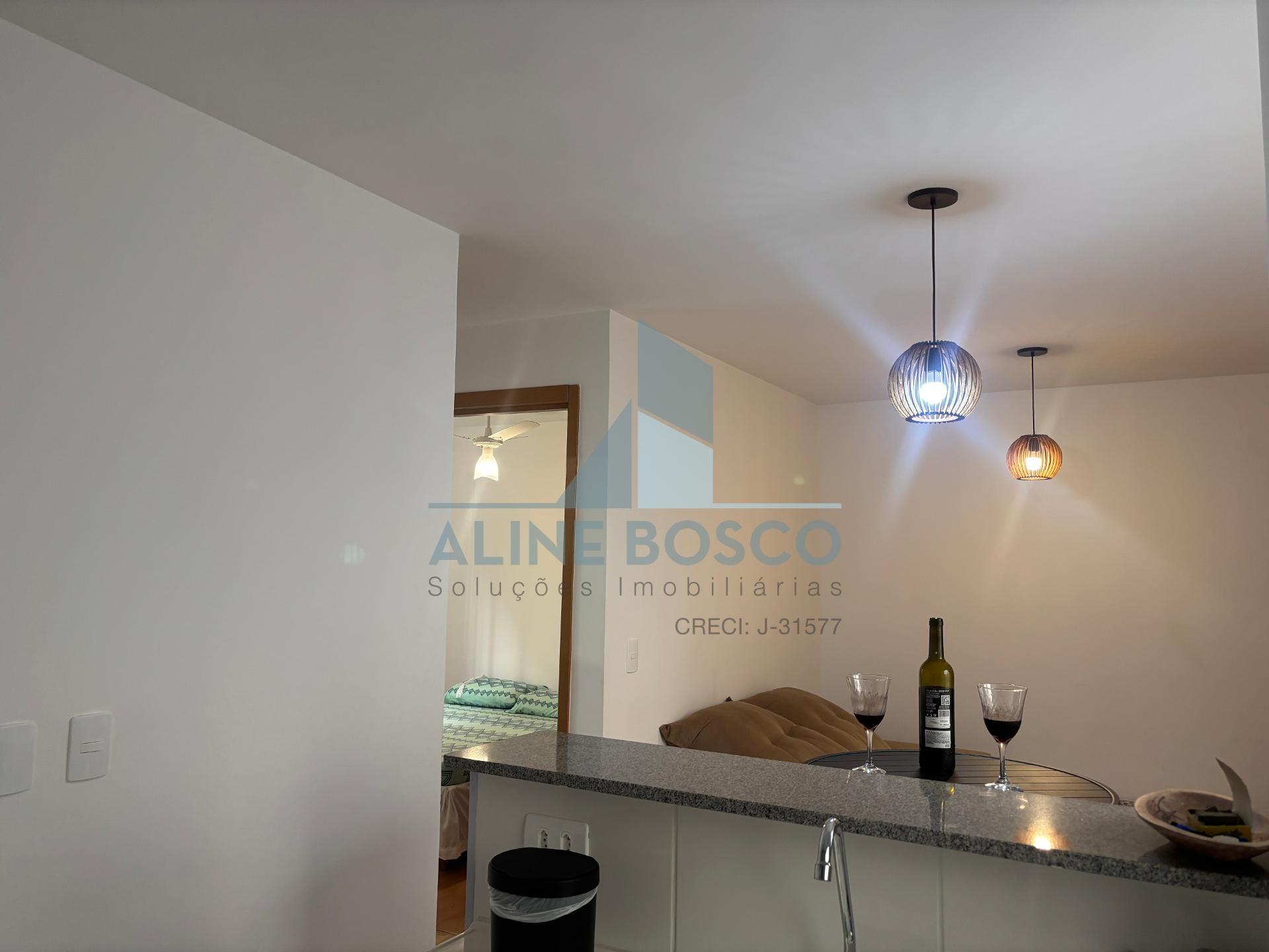O imóvel conta com dois dormitórios equipados com camas de casal. Um dos quartos possui aparelho de ar condicionado e o outro ventilador de teto, garantindo maior conforto térmico. A sala é aconchegante e já está mobiliada com sofá, enquanto a cozinha americana é equipada com fogão, geladeira e armários planejados.