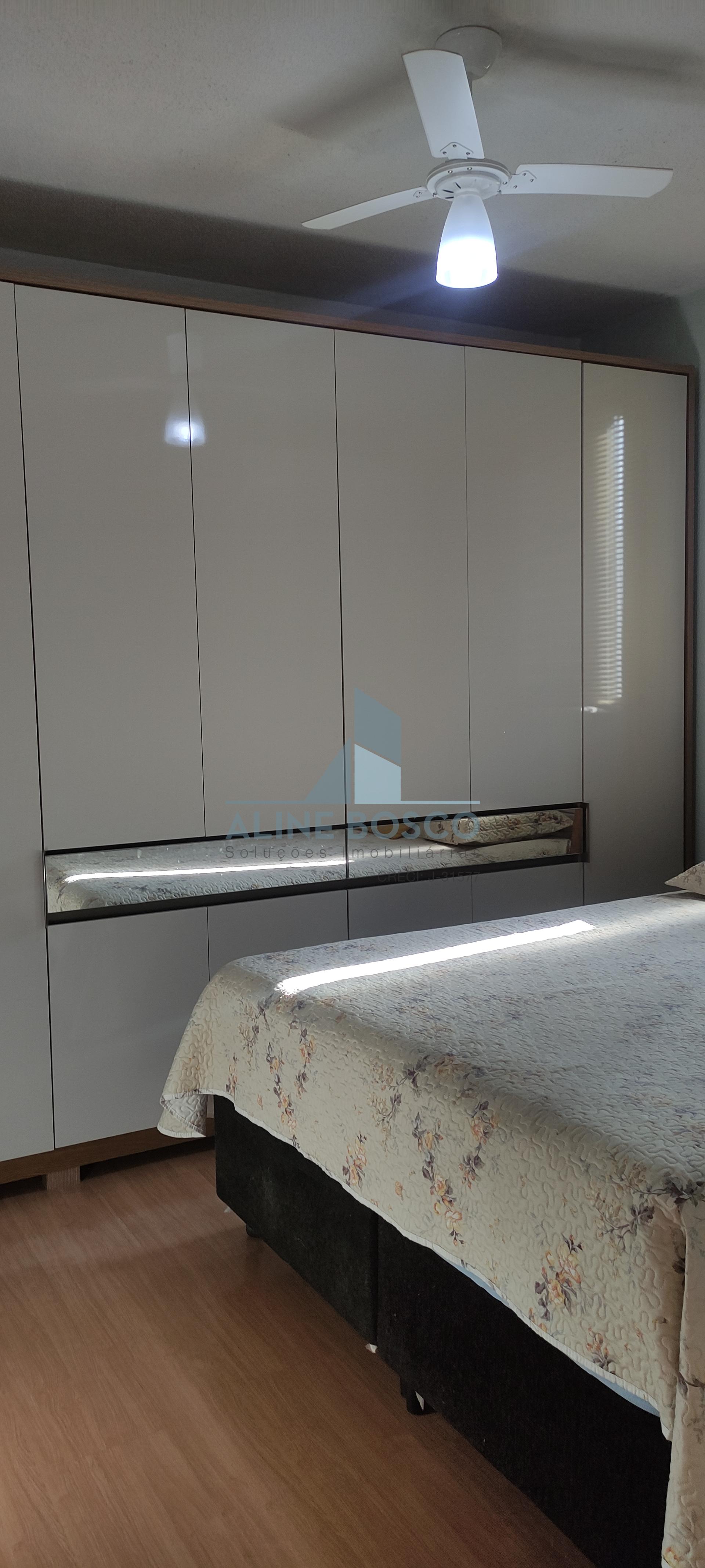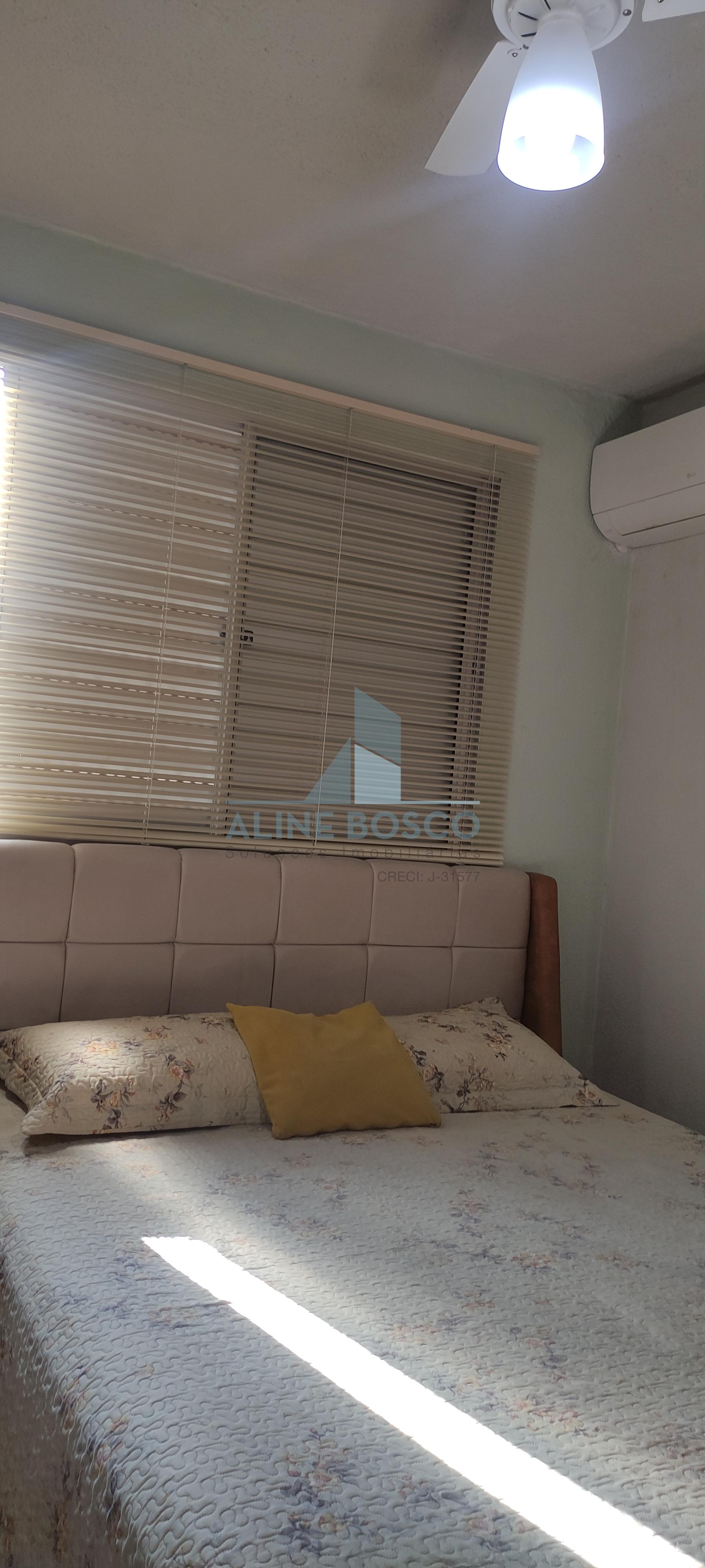 Armários na cozinha, banheiro e painel de TV na sala. Com persianas em todas as janelas, ventilador de teto na sala e quartos e ar condicionado.