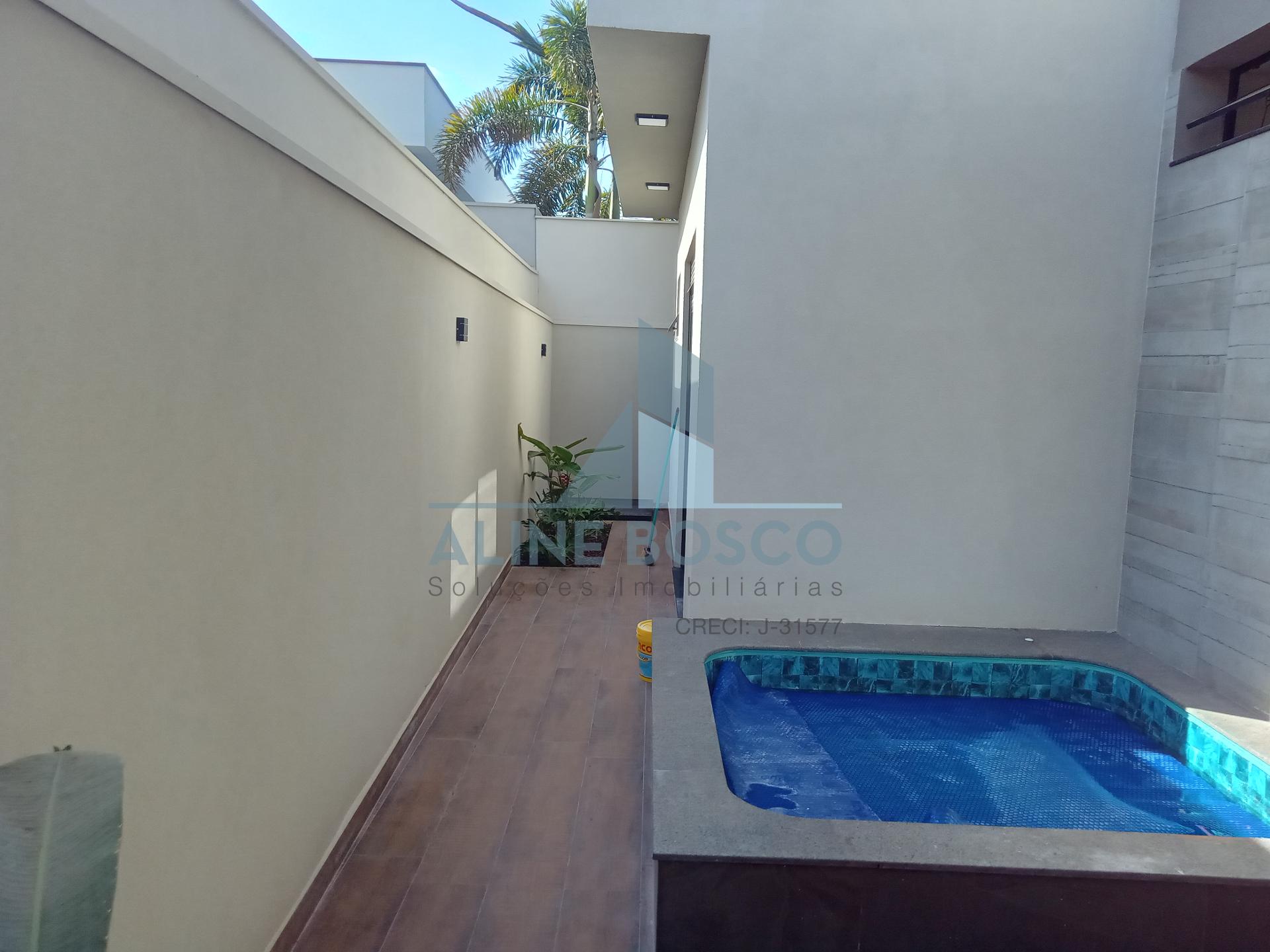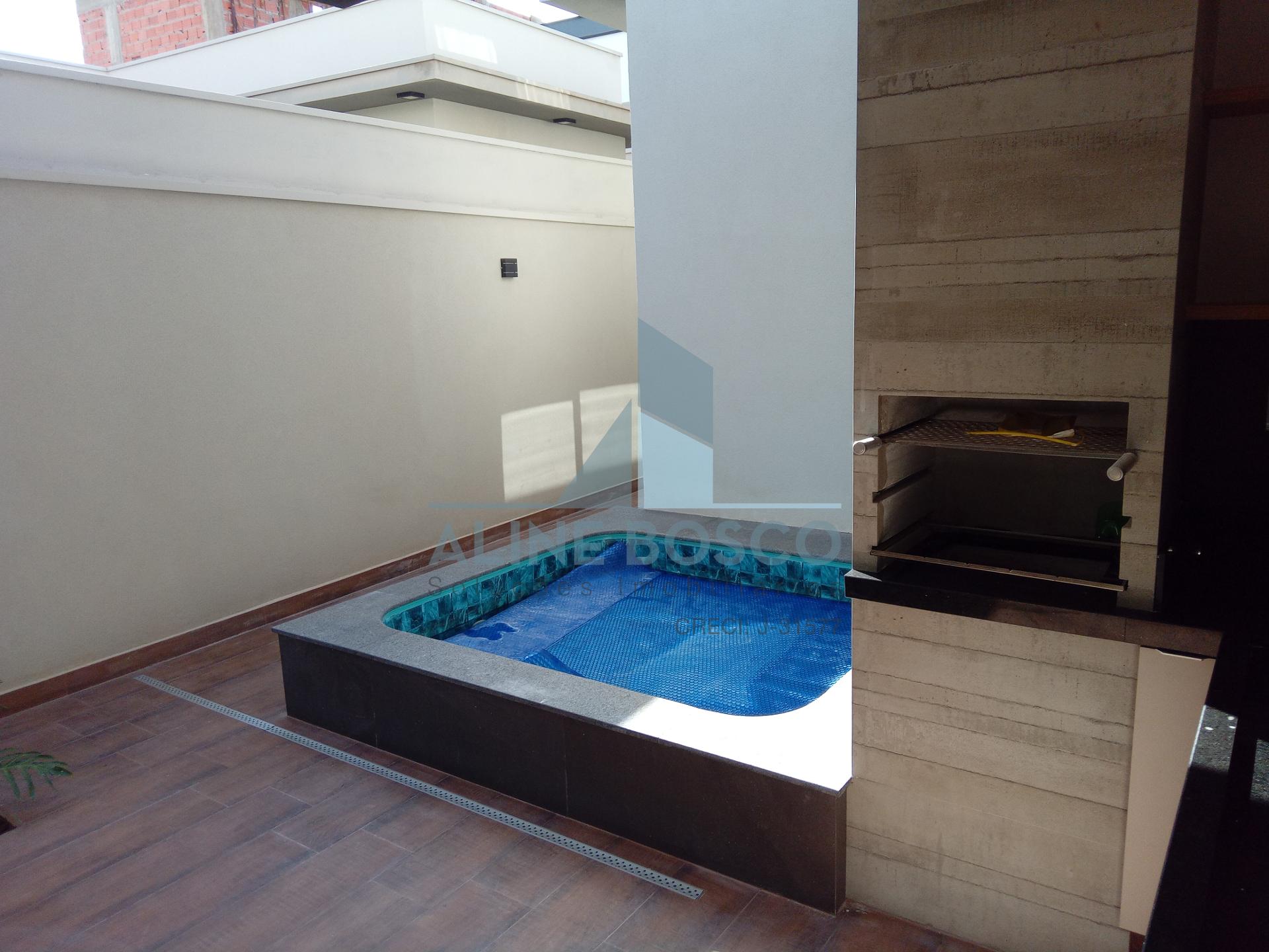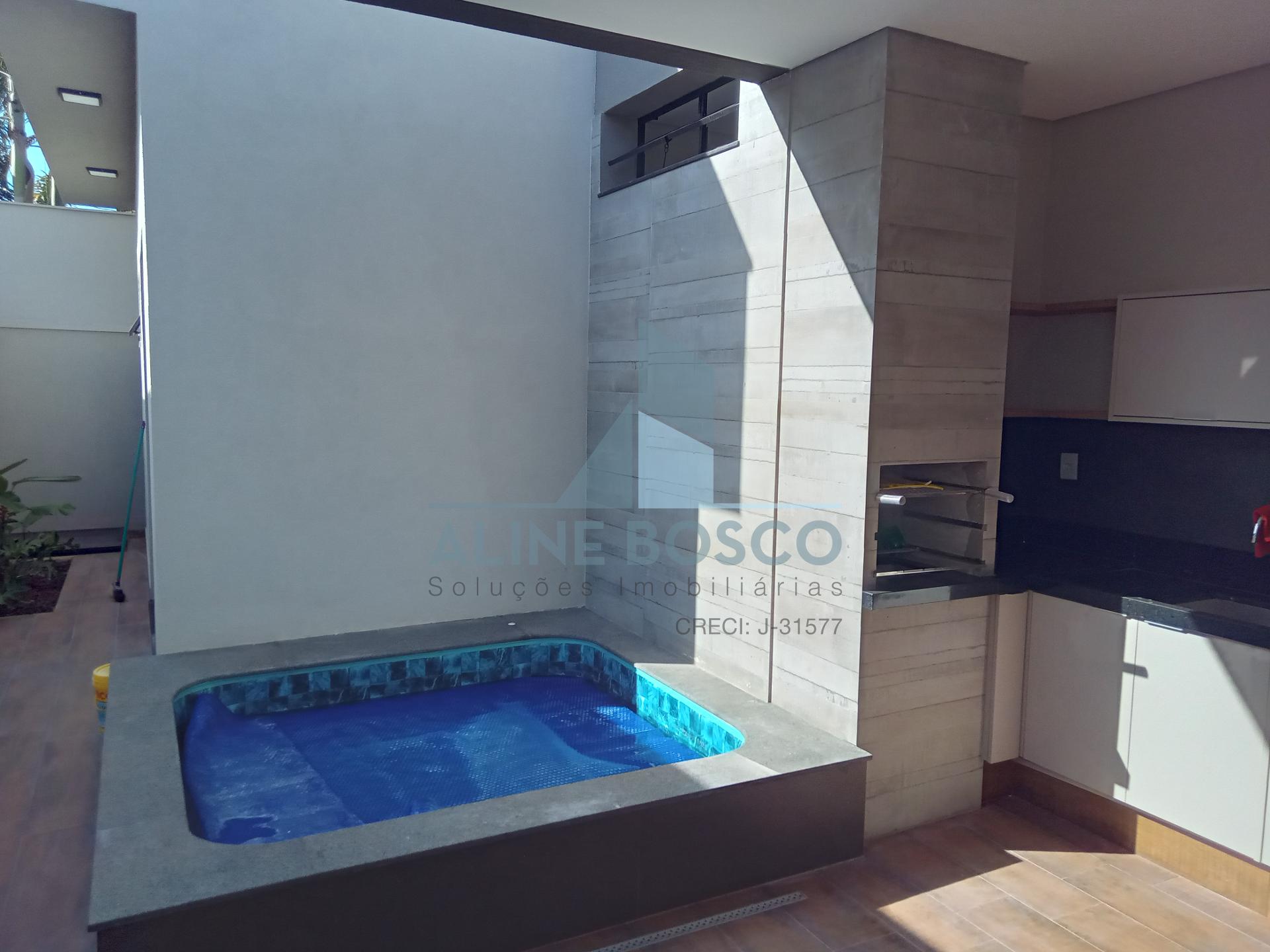 Casa térrea com 3 suítes completa de armários, escritório, sala ampla para 02 ambientes (jantar/estar), cozinha com planejados, área de serviço, garagem para 2 carros coberta, varanda gourmet com churrasqueira, Jacuzzi.