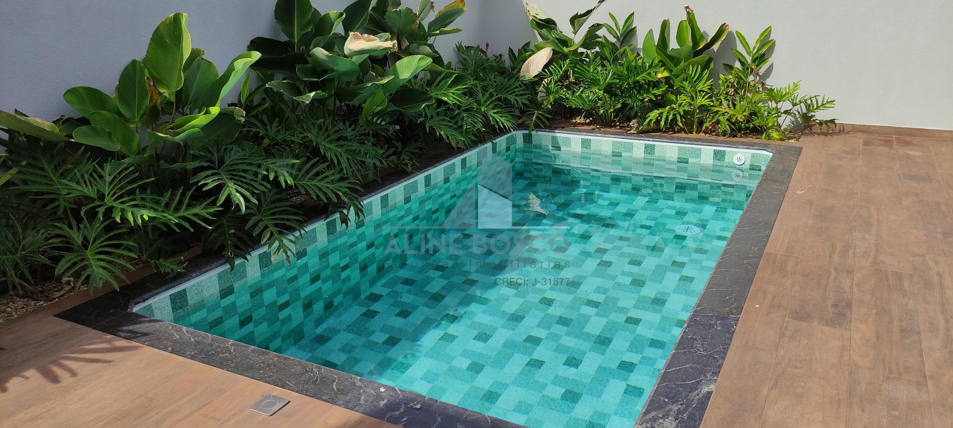 Área externa com linda piscina com acabamento premium, chuveiro externo, paisagismo e lavabo.